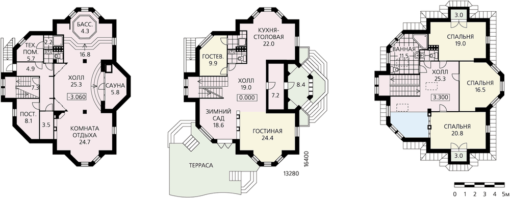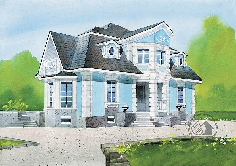 Любителям петровской эпохи наверняка понравится этот особняк, решенный в полном соответствии с традициями дворцовых построек. В строительстве же этот дом довольно экономичен, так как несущие стены выполнены из газобетона. Планировка дома современна и рациональна. Все помещения дневного пребывания первого этажа решены как часть единого пространства, и вместе с тем границы каждого из помещений четко фиксированы. В цокольном этаже блок помещений сауны также выполнен с учетом современных требований к организации пространства. В планировку можно внести необходимые изменения. Спальни второго этажа могут быть увеличены за счет просторного холла. При желании легко изменить и состав помещений дома.