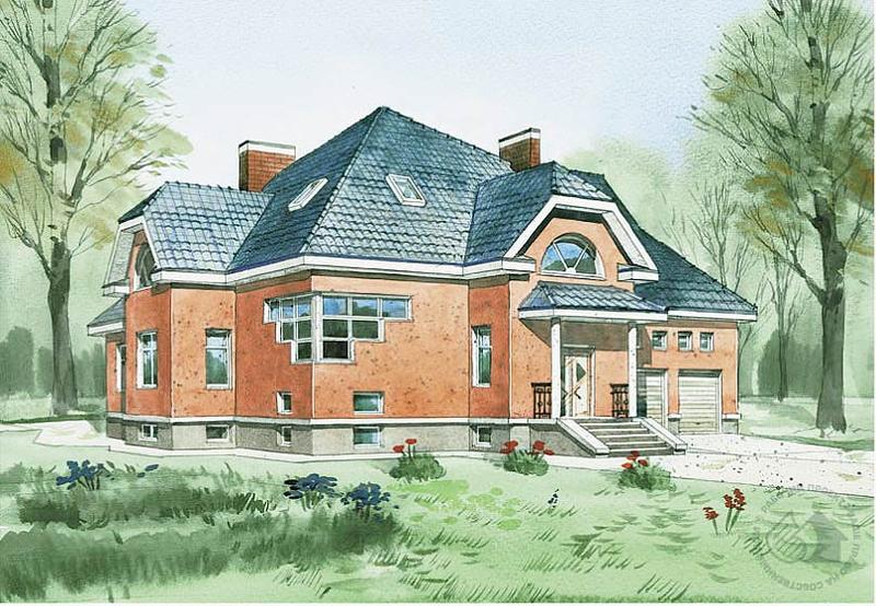 Особенностью этого большого представительного особняка является наличие диагональной планировочной оси. Такая композиция построения плана и объема всего дома может быть особенно удобна для постановки его на угловом участке. Дом имеет два равноценных и по-разному ориентированных входа, что также дает дополнительную свободу при расположении его на участке. Ядром композиции дома является двусветная гостиная, вокруг которой группируются все помещения первого и мансардного этажей. Украшением интерьера можно считать необычной формы лестницу, расположенную в угловом, смежном с гостиной холле. В небольшом цокольном этаже находятся котельная, тренажерный зал и кладовая. Мансардный этаж отдан зоне отдыха.