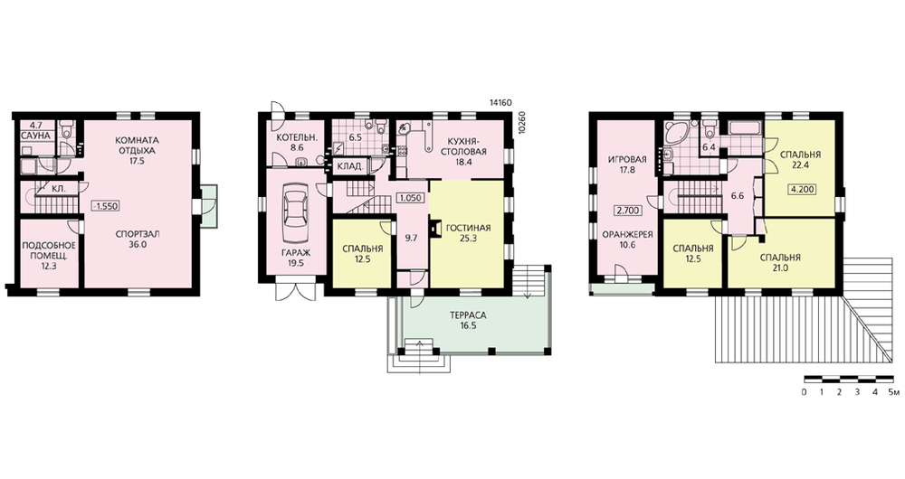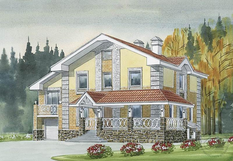 Перед вами очередная версия одного из самых любимых нашими заказчиками проекта. В данном случае проект представляет собой синтез двух более ранних версий. От третьего проекта он унаследовал планировку и общее решение объема, а от второго ему досталась великолепная угловая крытая терраса при входе. В цокольном этаже находятся сауна, тренажерный зал, комната отдыха и место для настольного тенниса. Цокольный этаж имеет свой выход на улицу, c жилой частью дома он связан двухмаршевой лестницей. На первом этаже жилая часть дома соседствует с гаражом и котельной. А предваряет вход в дом уже упомянутая выше терраса. Второй этаж решен в двух уровнях. На нижнем, над гаражом, – расположены бильярдная и оранжерея, на верхнем – три спальные и две ванные комнаты. Пластичные, богато декорированные фасады сделают этот дом заметным сооружением в любой архитектурной среде.