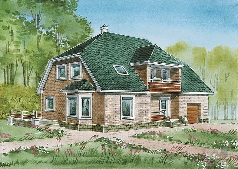 Очень лаконичный по своему внешнему облику дом тем не менее не может остаться незамеченным. Экономичность предложенного решения обусловлена отсутствием цокольного этажа и транзитных зон, рациональным использованием мансардного пространства. Но внешняя простота сочетается здесь с высокой степенью комфорта, богатыми интерьерными возможностями и рациональной планировкой. Главной доминантой внутреннего пространства дома является деревянная, необычной формы лестница, расположенная в холле, это не только композиционный центр дома, но и его украшение. Большой гараж на два автомобиля, ванные комнаты на каждом из этажей, вместительная гардеробная обеспечивают высокий уровень комфорта. В доме есть небольшое подполье, в которое ведет лаз из топочной.