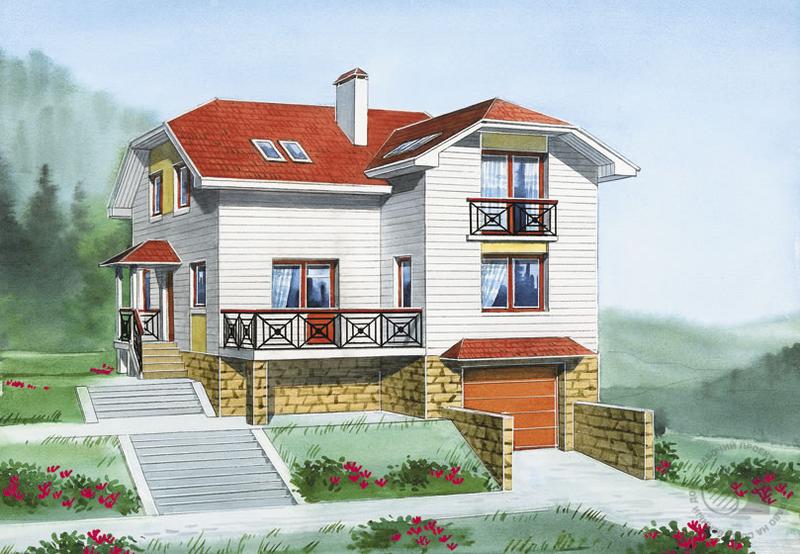 Если ваш участок расположен в холмистой местности или на склоне, обратите внимание на проект этого дома. Хотя возможность посадки на сложный рельеф – не единственное его достоинство. В очень небольшом объеме удалось разместить все помещения, необходимые для комфортной жизни и отдыха семьи. В цокольном этаже расположены хозяйственные и служебные помещения. На первом этаже, помимо кухни-гостиной, находятся две жилые комнаты, назначение которых может быть изменено. Так, на месте кабинета можно оборудовать кухню, освободив таким образом пространство гостиной от кухонного оборудования. В мансардном этаже на месте комнаты-холла вполне возможно разместить дополнительную спальню. Можно также обойтись и без гардеробной в одной из спален, увеличив таким образом ее площадь.