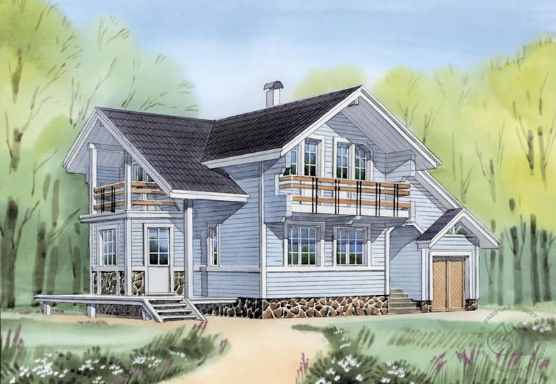 Предлагаем вашему вниманию деревянный дом из бруса. Традиционность используемого материала очень удачно сочетается здесь с современным подходом в объемно-планировочном решении здания. В доме всего два этажа, отсутствуют подвал и мансарда. На первом этаже к жилой части дома примыкает гараж на два автомобиля, въезд в который решен с двух противоположных сторон, что делает возможным компактное и рациональное решение планировки первого этажа не в ущерб вместимости гаража. В жилой части единое пространство кухни-гостиной соседствует с двумя спальнями. На втором этаже расположены еще три спальни и большая кладовая. В пониженной части дома над гаражом находится чердак, который может использоваться по усмотрению хозяев дома.