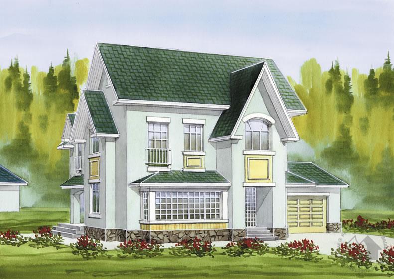 Многие проекты, трансформируясь и видоизменяясь в процессе адаптации под конкретного заказчика, приобрели разнообразные варианты. Так произошло и с этим проектом. В данной версии проект утратил огромный цокольный этаж, который был в первоначальном варианте, но приобрел пристроенный гараж на два автомобиля. Некоторые изменения претерпела и конфигурация самого дома, что позволило получить небольшую, но очень симпатичную крытую террасу со стороны дворового фасада. Первый этаж традиционно решен как зона дневного пребывания семьи с просторной гостиной и кухней-столовой. Великолепный витраж гостиной во всю ширину стены создает иллюзию слияния внутреннего пространства дома и внешней среды. На втором этаже расположились три спальни, ванная комната и светлая гардеробная.