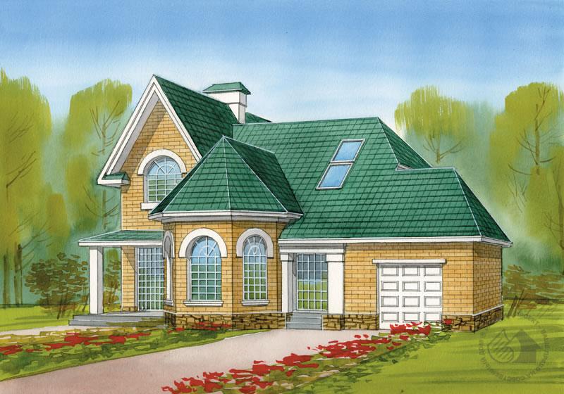 Отличие данного варианта от первоисточника заключается в появлении пристроенного гаража и в некоторой перепланировке на первом этаже. Благодаря тому, что один из фасадов дома первоначально был полностью глухой, блокировка гаража не повлекла внутренней перепланировки и не лишила помещения дома дневного света. При этом удалось обеспечить удобную связь жилой части дома и гаража через входной тамбур. Также в предлагаемом варианте на месте спальни появились парная с комнатой отдыха. Решенные в одном блоке с ванной комнатой и тамбуром эти помещения представляют собой комфортабельную зону релаксации. Гостиная и кухня-столовая – единое пространство, которое условно отделено от холла перепадом отметок пола. В этом варианте также сохранена красивая, необычной формы лестница в гостиной. В мансарде расположены три спальни и ванная комната. Часть планировки, выполненная в перегородках, может быть откорректирована.