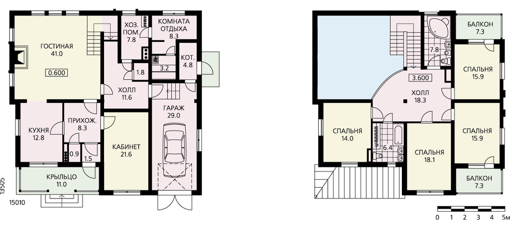 Кажущаяся простота и незамысловатость внешнего облика этого дома с лихвой компенсируются выразительной внутренней планировкой. Доминанта этой планировки – просторная двусветная гостиная с камином, открытой двухмаршевой лестницей и большими остекленными витражами. Через эти витражи открывается великолепный вид на окружающий природный ландшафт. Внешнее пространство как бы перетекает внутрь дома и заполняет его интерьеры воздухом, солнечным светом, сосновым ароматом. Вокруг гостиной группируются все остальные помещения: из нее через небольшой холл можно попасть в служебную часть с сауной и гаражом, а можно подняться на второй этаж, где расположена приватная зона дома. Четыре спальни и две ванные комнаты выходят в холл, с балкона которого открывается прекрасный вид на второй свет гостиной.