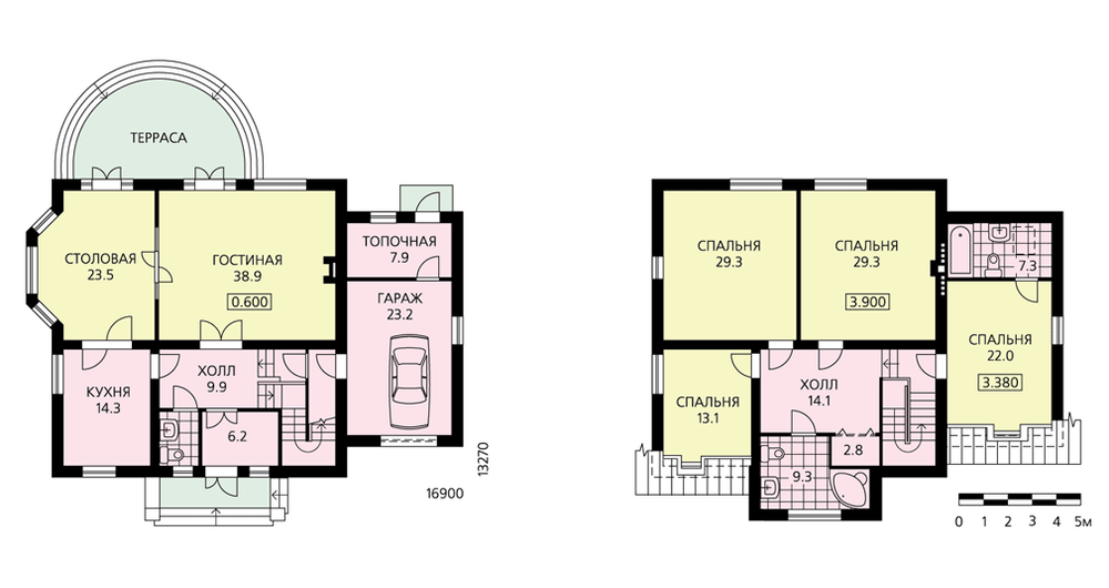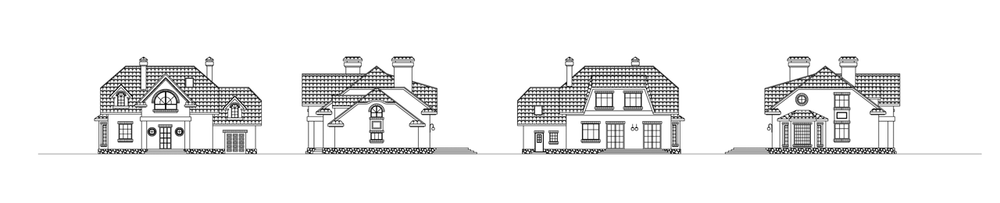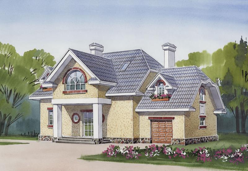 Классический загородный особняк, уже при первом, беглом взгляде на который возникает ощущение уюта, комфорта и домашнего тепла. Вход оформлен монументальным порталом с колоннами и треугольным фронтоном. Он как бы приглашает войти внутрь. Минуя прихожую, мы оказываемся в небольшом холле – это распределительная зона дома. Отсюда можно попасть во все его помещения, спуститься в гараж или подняться в мансарду. Но самые первые помещения, в которые мы попадаем, минуя холл, – это гостиная и кухня. Расположенная между ними столовая является связующим пространством. От гостиной она отделена перегородкой, которая может быть заменена витражом или заполнена прозрачными стеклопакетами. Из гостиной и столовой можно выйти на великолепную полукруглую террасу и спуститься в сад. Мансарда – приватная зона дома, здесь расположены четыре спальни и две ванные комнаты.