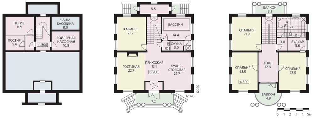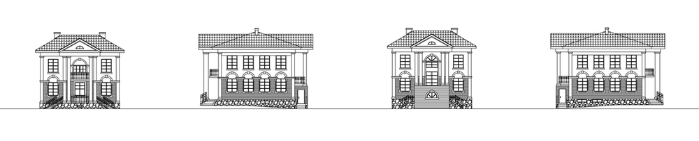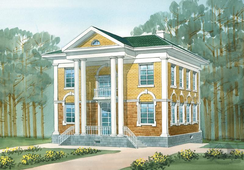 Особняк в неоклассическом стиле с колоннами, портиком, великолепной парадной лестницей и классическими пропорциями. Все четыре фасада проработаны одинаково тщательно, а два парадно решенных входа делают таковыми и фасады, на которых они расположены. В доме два полноценных жилых этажа, технический подвал и чердак. Внутреннее пространство дома соответствует его внешнему облику. Половину площади первого этажа занимает пространство гостиной, холла и кухни-столовой. При желании оно может быть зонировано перегородками на отдельные помещения. Остальная площадь первого этажа поделена между кабинетом и зоной отдыха с бассейном, сауной и душевой. Второй этаж – спальная зона дома с тремя спальнями, ванной комнатой и будуаром. Все помещения, включая ванную комнату, имеют двустороннее освещение, что повышает комфорт проживания и облегчает ориентацию дома по сторонам света.