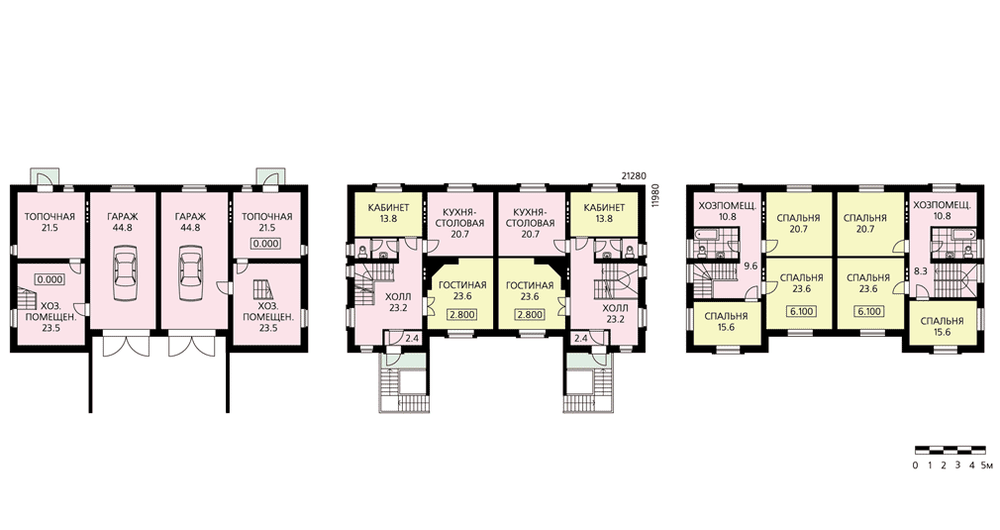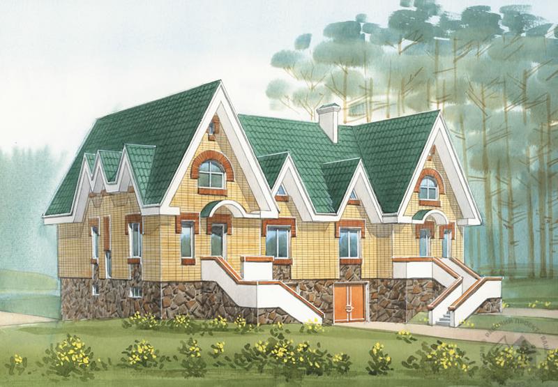 Сблокированный из двух зеркальных секций жилой дом рассчитан на проживание двух семей. Жесткая конструктивная схема определяет и четкую, строгую планировку дома. Дом двухэтажный с цокольным этажом и чердаком. Цокольный этаж, в котором расположены гараж, топочная и хоз. помещение, лишь незначительно заглублен, и все его помещения светлые. На первый этаж ведет высокая двухмаршевая лестница. Здесь каждая из квартир имеет по просторному, светлому лестничному холлу, гостиной, столовой и кабинету. Планировки квартир абсолютно идентичны, за исключением формы внутренних лестниц. Мансардный этаж решен как спальная зона с тремя спальнями, ванной комнатой и хоз. помещением. Назначение хозяйственного помещения может быть другим, оно может стать небольшой гостевой комнатой или гардеробной. Чердак в доме не эксплуатируется, на планах он не показан.