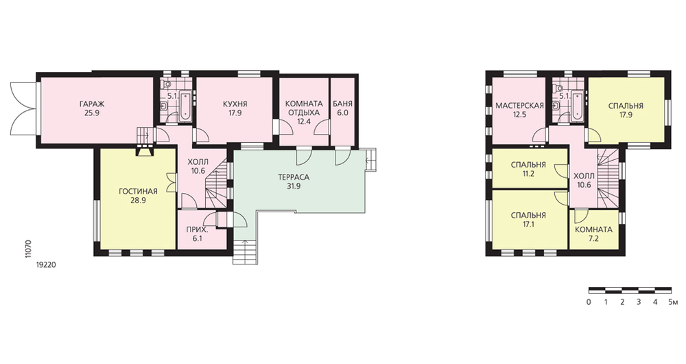 По своему архитектурному решению дом вполне может стать частью городской застройки, при том что он вполне гармонично впишется и в среду коттеджного поселка. Строгие, элегантные фасады, удобная, комфортабельная планировка, лишенная избыточных площадей, – достаточно веские аргументы в пользу выбора этого проекта. Въезд в гараж и главный вход в дом разнесены на разные фасады. При этом вход в дом решен со стороны двора, он как бы спрятан от уличного шума, суеты и посторонних глаз. Первый этаж условно можно разделить на три части: жилую с гостиной и кухней, служебную с баней и комнатой отдыха и гараж. Между собой они очень удобно связаны и составляют единое целое. Второй этаж полностью отдан спальной зоне. Площадь его меньше первого этажа, так как гараж одноэтажный.