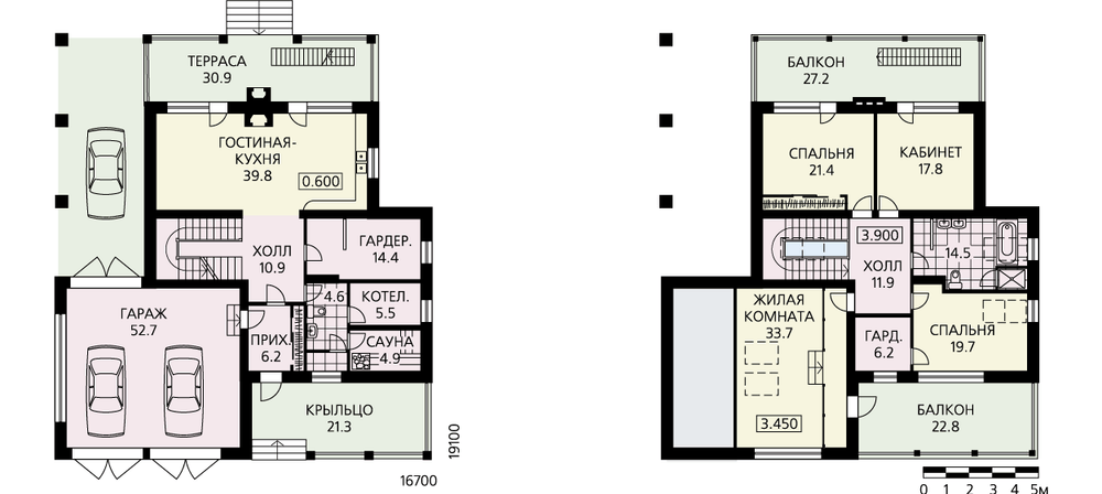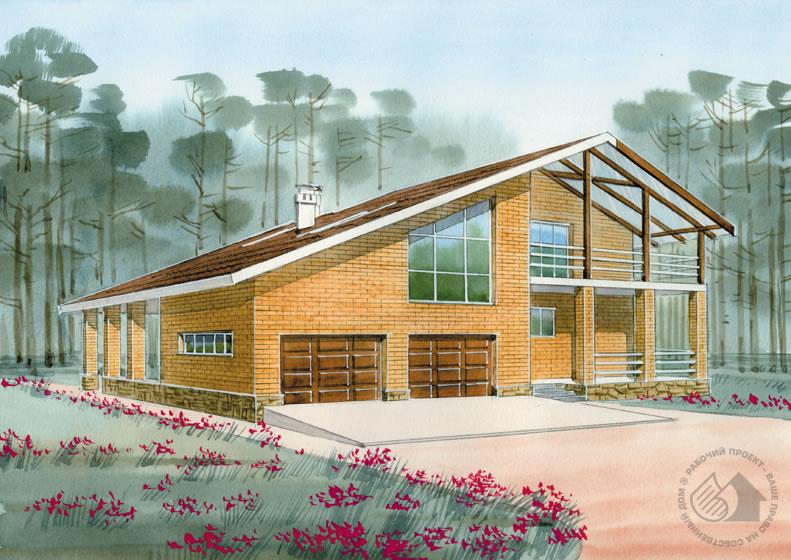 Кирпичный дом с гаражом и террасами. Характер, планировка и состав помещений располагают к приятному, комфортабельному отдыху. Вместительный гараж и навес на две машины позволят без проблем разместить здесь автомобили всех членов семьи, приехавших отдохнуть на уикенд. Четыре крытые террасы, одна из которых с камином барбекю, позволят отдохнуть на свежем воздухе даже в плохую погоду. А небольшая сауна добавит приятных минут этому отдыху. На первом этаже дома расположены гостиная, совмещенная с кухней и столовой, а также уже упомянутые гараж, сауна и террасы. В мансарде находятся три спальни и ванная комната. Каждая из спален имеет выход на террасу, одна из спален оборудована гардеробной. Еще одна жилая комната находится над гаражом. Она может использоваться как бильярдная, игровая или студия, в зависимости от пристрастий и образа жизни обитателей дома.