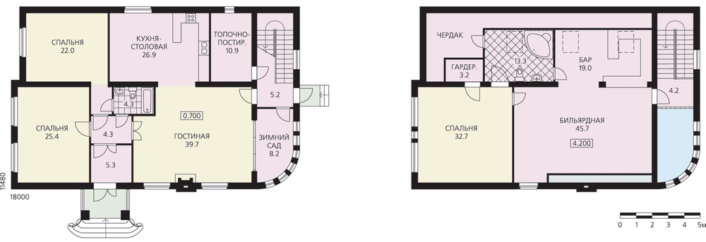 Планировка этого комфортабельного коттеджа располагает к отдыху и приятному времяпрепровождению на лоне природы. Двусветный зимний сад на первом этаже, просторная бильярдная и бар в мансарде – лучшее подтверждение этому. В планировке отсутствует жесткое зонирование. На первом этаже гостевая зона дома с гостиной и кухней-столовой соседствует со спальными комнатами. Между собой они разделены небольшим тамбуром. Кухня-столовая и гостиная решены как единое пространство. Двусветный зимний сад отделен от гостиной остекленным витражом. Мансарда по проекту отдана в распоряжение мужчин. Большую ее часть занимают бильярдная и бар. Дополняют планировку спальня и ванная комната. При желании планировка мансарды может быть изменена, на месте бильярдной с баром можно разместить жилые помещения.