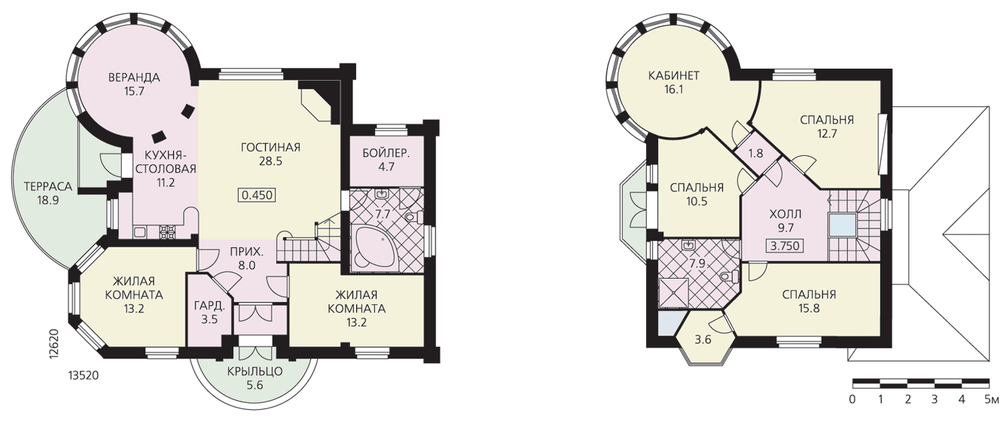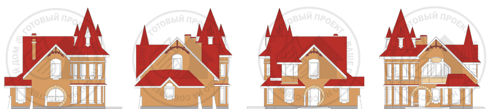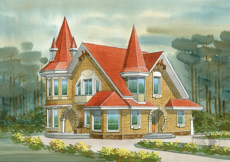 Небольшой дом, похожий на сказочный замок, в котором живут реальные люди. Декоративность ему придают большое количество башен и башенок, проемы различной формы, элементы декоративного фахверка. Дом с таким ярким обликом не может быть серийным сооружением в застройке одного коттеджного поселка, это скорее эксклюзивное решение. При этом конструктивная схема и внутренняя планировка дома современны и комфортабельны. В доме нет подвала, его основанием является монолитная ж/б плита. Минимальное количество внутренних несущих стен позволяет получить большие светлые помещения на первом этаже. Так, гостиная, кухня-столовая и веранда решены как единое пространство. Интересно решена веранда, расположенная в круглой башне. Вся планировка второго этажа выполнена в перегородках и может быть откорректирована. Неизменным останется великолепное помещение в круглой башне, по проекту это кабинет.