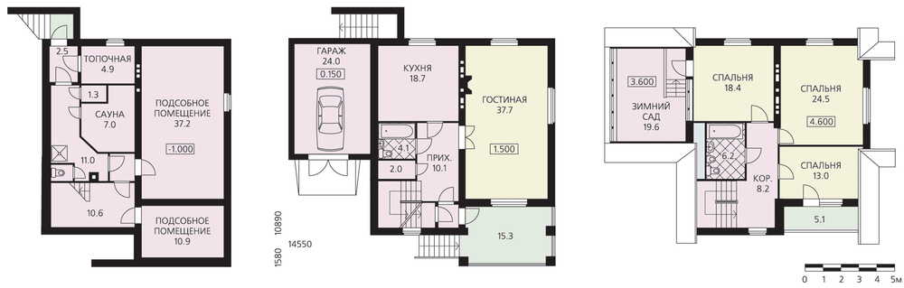 Загородный дом с пристроенным гаражом и ступенчатым рисунком окон на главном фасаде. Жилая часть дома трехэтажная, с учетом цокольного этажа и мансарды. Гараж представляет собой одноэтажную пристройку с мансардой. На первый этаж ведет высокая лестница, вход в дом предваряет крытая терраса. Целый пролет первого этажа занимает гостиная. Это просторное помещение с трехсторонним освещением и камином. Кухня – изолированное помещение, ее площадь вполне позволяет разместить здесь еще и столовую. В мансарде над жилой частью дома расположены три спальни и ванная комната. В мансарде над гаражом размещен зимний сад, попасть сюда можно непосредственно из спален. Цокольный этаж частично занят служебными и техническими помещениями, частично является резервом свободной площади дома. Пристроенный гараж решен автономно и не имеет внутренней связи с домом.
