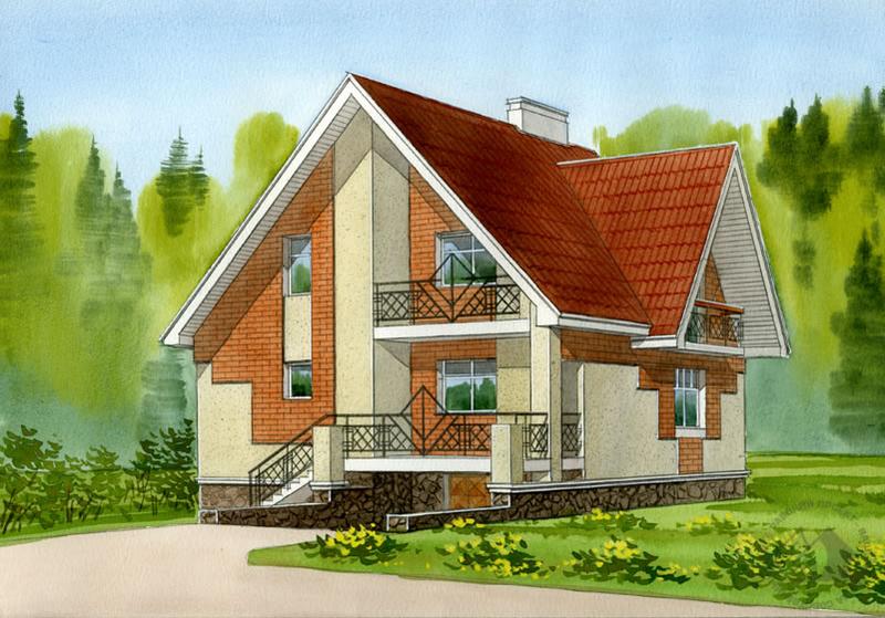 Четырехкомнатный коттедж со встроенным гаражом. Гараж расположен в цокольном этаже, при этом въезд организован ниже отметки земли, что может привести к скапливанию дождевой воды и другой влаги на въездном пандусе. Для того чтобы избежать подобных неприятностей, в проекте предусмотрен козырек-терраса, который предохранит въезд от осадков. А грамотный дренаж защитит от ненужной влаги на земле. Всего в доме три этажа, включая цокольный и мансарду. В цокольном этаже кроме гаража находятся топочная и парная со вспомогательными помещениями. На первом этаже расположены гостиная и кухня. Просторная терраса предваряет вход в дом. В мансарде – спальная часть дома. Из трех расположенных здесь спален одна имеет свой балкон, еще на один балкон можно попасть из холла.