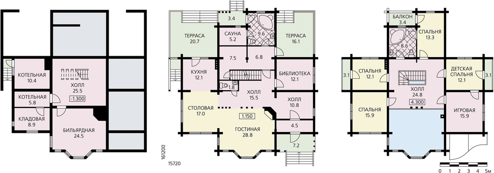 Просторный, вместительный и очень комфортабельный дом для многочисленной семьи. На двух этажах расположены жилые помещения, в подвале под частью дома – котельная, бильярдная и служебные помещения. Большие открытые террасы снаружи дома гармонично дополняют его внутреннюю планировку. На первом этаже холл, столовая, гостиная и кухня объединены в одно помещение, площадь которого превышает 70 м2. При этом гостиная решена как двусветное помещение с великолепными витражами на всю высоту. Это позволяет зрительно увеличить пространство гостевой зоны и сделать его более светлым. Планировка первого этажа дополнена библиотекой и сауной. В мансарде расположены пять спален и ванная комната, все они группируются вокруг просторного лестничного холла. Планировка с таким количеством жилых помещений позволит не только разместиться здесь одной семье, но и принимать многочисленных гостей.