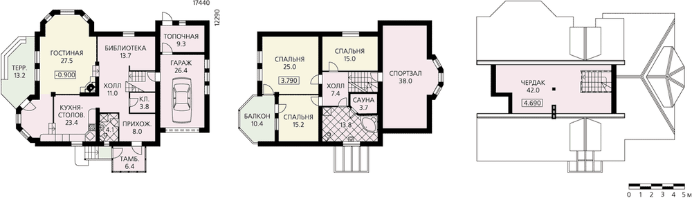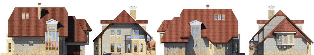 Под высокой кровлей спрятаны два из трех этажей этого дома. На первом этаже сосредоточены все его основные помещения, здесь и просторная светлая гостиная, и расположенные на возвышении кухня-столовая и библиотека. Гараж с топочной запроектированы в пристройке. Гостевые помещения очень удобно связаны между собой, образуя единое пространство. При этом ничто не мешает изолировать их друг от друга. Можно также переоборудовать библиотеку в дополнительную спальню, отделив ее от холла перегородкой с дверью. На втором, мансардном этаже расположены три спальни и ванная комната, совмещенная с сауной. Две смежные спальни имеют большой балкон-лоджию. На полэтажа ниже, над гаражом, находится спортивный зал. Это просторное помещение с остекленным эркером. На чердаке предусмотрено еще одно помещение. Здесь вполне возможно оборудовать студию или художественную мастерскую.