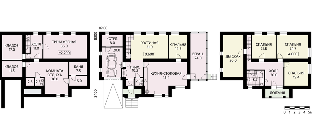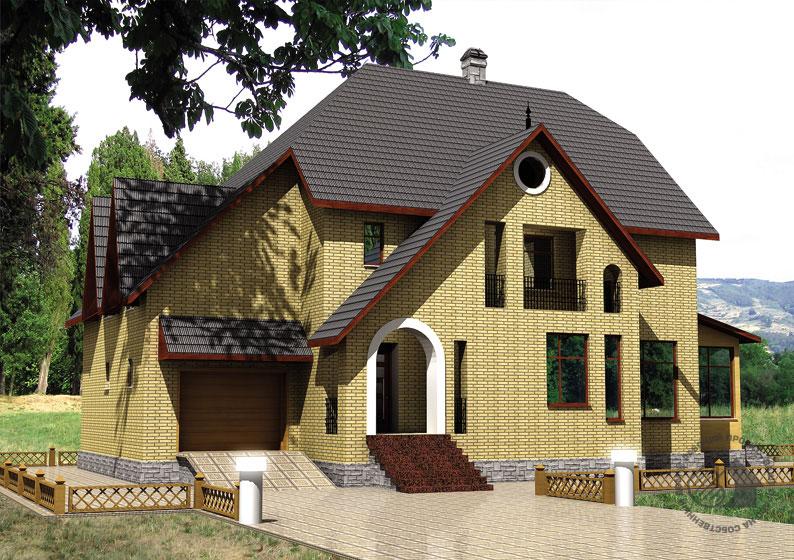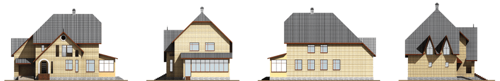 В этом трехэтажном особняке с комфортом разместится большая семья. Комфортность обеспечивается как за счет состава помещений, так и их количества и площади. В цокольном этаже размещена полноценная зона релаксации. Она включает в себя большой тренажерный зал, комнату отдыха и, конечно, баню. Две вместительные кладовые дополняют эту планировку. На первом этаже расположены гостевые помещения. К ним в первую очередь относятся просторная гостиная и просто огромная кухня-столовая. Небольшая жилая комната, отделенная от гостиной перегородкой, может быть гостевой или библиотекой. Возможен вариант небольшой перепланировки, когда убирается перегородка и на месте комнаты организуется диванная – как часть гостиной. На втором этаже находится четыре жилые комнаты и ванная. Детская, расположенная над гаражом, на пол-этажа ниже остальных помещений. Чердак по проекту не эксплуатируется.