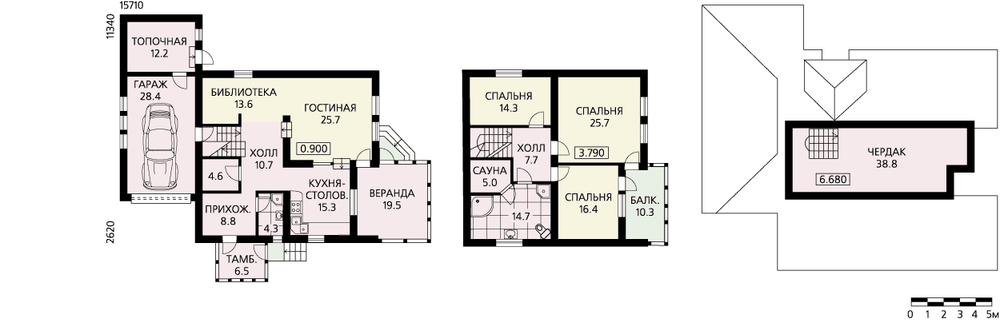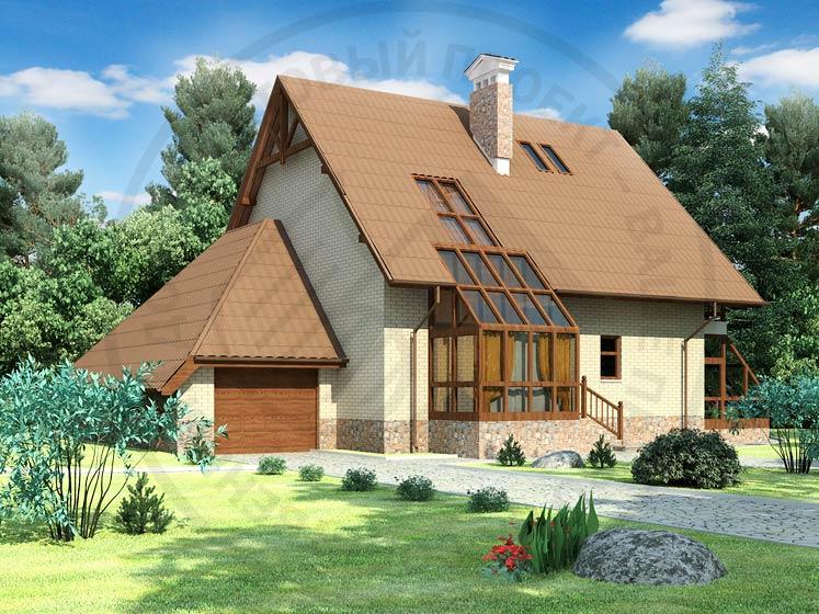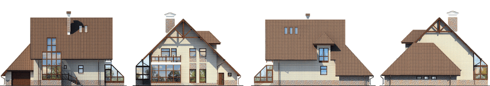 Дом-шале с низко, почти до самой земли спускающейся кровлей привлекателен как своим внешним обликом, так и планировкой. Объемно-планировочное решение учитывает современные требования, предъявляемые к домам усадебного типа. Здание четко зонировано по функциональному использованию помещений. На первом этаже расположена зона дневного пребывания семьи: прихожая, гостиная, кухня-столовая, библиотека и хозпомещение. Использованный прием свободной планировки без жестких границ помещений позволяет получить максимальный простор и свободу пространства. Этому же способствует и высота гостиной, увеличенная за счет разницы в уровне пола на 450 мм. К наружному контуру жилой части дома примыкают гараж и топочная. На втором этаже сгруппированы спальни, ванная и сауна. Две смежные спальни имеют выход на балкон. Чердачный этаж при определенных мероприятиях может быть приспособлен для проживания или хозяйственных нужд. Подвал в доме отсутствует.