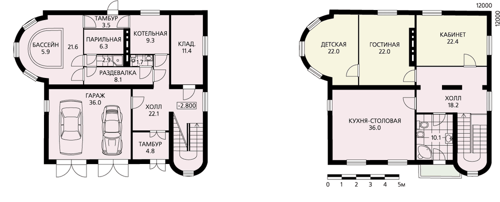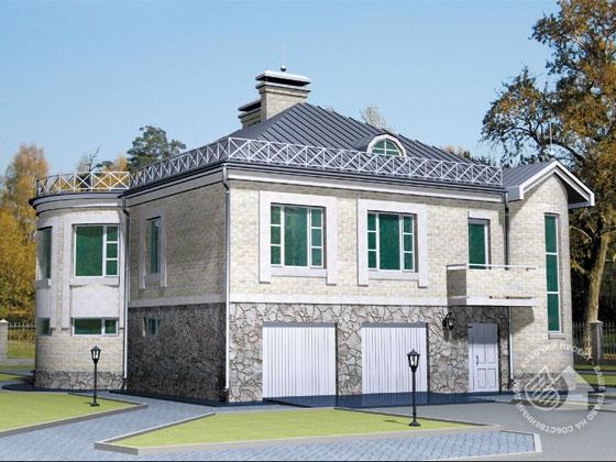 Большой, массивный особняк, облик которого смягчает полукруглая ротонда. Образ дома благодаря пропорциям, высокому цоколю, низкой кровле вызывает ощущение основательности и даже некоторой тяжеловесности. В доме два этажа, включая цокольный, чердак не эксплуатируется. Планировка решена так, что цоколь не заглублен, а расположен на уровне земли. И здесь размещены все технические и служебные помещения. Это и гараж на две машины, и зона релаксации с сауной и бассейном и котельная. Чаша бассейна гармонично вписана в уже упомянутую ротонду. Первый этаж – жилая часть дома. Проектом здесь предусмотрены огромная кухня- столовая, кабинет и гостиная с детской. Серьезный изъян планировки – отсутствие спален, можно исправить с помощью перепланировки. Например, кухню совместить гостиной, а на освободившейся площади расположить две спальни. Кабинет также может изменить свое назначение и служить еще одной спальной комнатой.