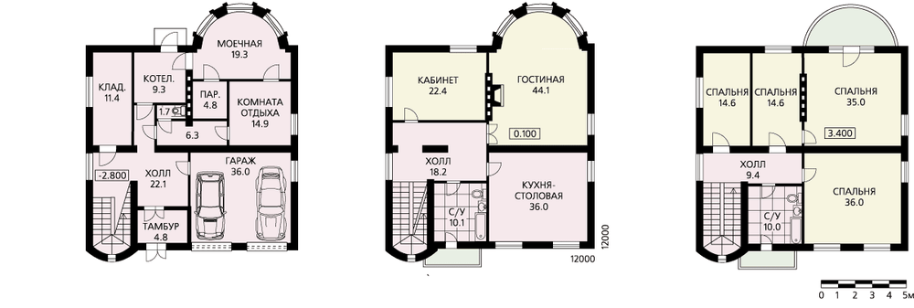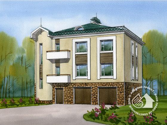 Большой монументальный особняк с современной планировкой. Состав помещений обеспечивает повышенный уровень комфорта для многочисленной состоятельной семьи. В доме три этажа, включая цокольный. Есть чердак, по проекту он не эксплуатируется. Попасть на него можно через лаз из холла второго этажа. Планировка выдержана по принципу четкого поэтажного зонирования. В цокольном этаже наряду с зоной релаксации размещены большой гараж на два автомобиля и служебные помещения. Надо отметить, что вход в дом решен так же через цокольный этаж. Первый этаж – представительская часть дома. Планировку этажа отличают большие по площади помещения гостиной, кухни-столовой и кабинета. Просторная, светлая гостиная с камином и красивым полукруглым эркером – безусловный акцент этой планировки. На втором этаже четыре спальные комнаты. Две из них так же имеют большие габариты и площади. Предложенная проектом планировка, частично выполненная в перегородках, может быть изменена и откорректирована по желанию владельцев дома. В общей площади не учтен чердак.