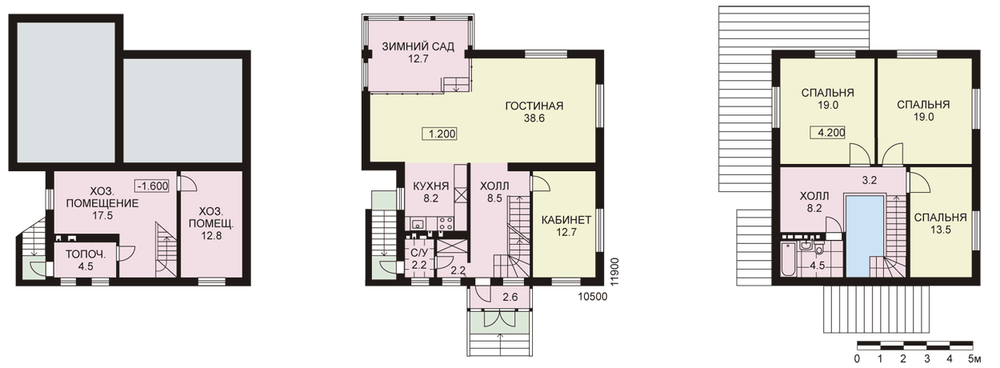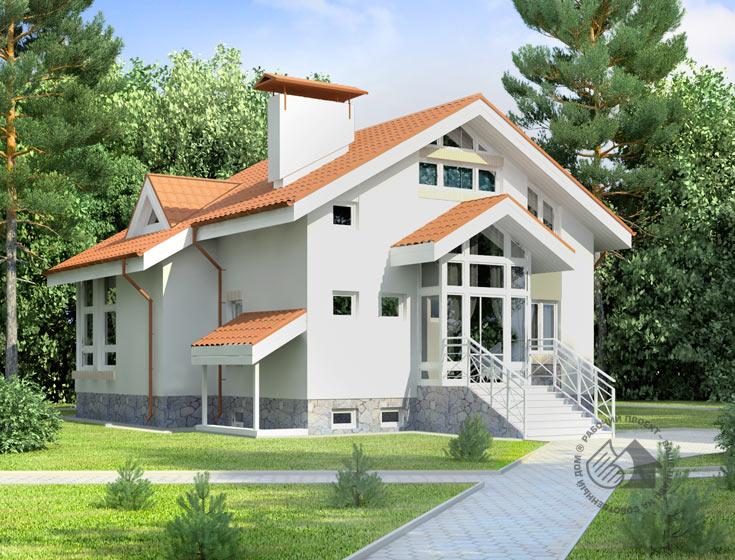 Современный особнячок, не лишенный определенной изысканности. И в первую очередь это заслуга зимнего сада, который формирует как внешний облик дома, так и его внутреннее гостевое пространство на первом этаже. Он представляет собой полностью остекленный эркер, выступающий за пределы основных габаритов дома. В плане зимний сад решен как часть гостиной с небольшим понижением отметки пола. Такой прием позволяет создать некое подобие балкона в гостиной, с которого можно созерцать всю красоту вечнозеленой растительности. Но жизнь в доме не ограничивается одним этим, хоть и примечательным местом. Проектом предусмотрено три этажа, включая небольшой подвал с топочной и хозяйственными помещениями и мансарду. На первом этаже гостевые помещения с уже упомянутым зимним садом. В мансарде расположены три небольшие спальни, компактная ванная и холл-игровая. Рядом с лестницей удалось создать небольшое «окно» второго света.