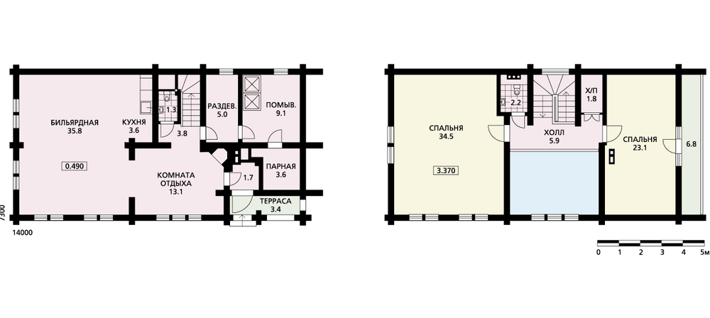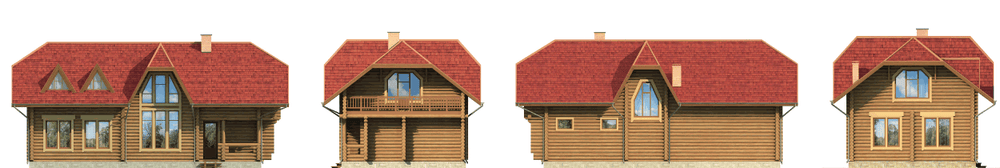 Вытянутый в плане домик из оцилиндрованного бревна хорошо расположить на берегу озера, повернутым к воде большим двусветным окном из гостиной. В доме есть все необходимое для отдыха, на первом этаже зал-гостиная с камином и бильярдной, комната отдыха, парная и даже мини-кухня. На втором этаже расположены две по-настоящему большие спальни, с внутреннего балкона второго этажа открывается вид на гостиную и озеро.