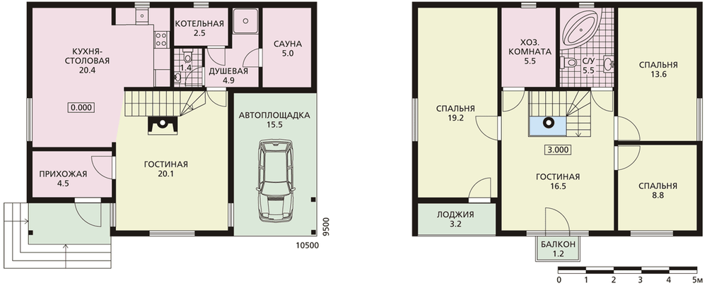 Монолитная плита основания позволит использовать для строительства даже участки со сложными грунтами. Планировка решена по принципу необходимой достаточности, нет излишних по функции помещений. На первом этаже расположены гостиная и кухня-столовая, санузел, котельная, и сауна с душем в раздевальной. В мансарде предусмотрены три спальни, главная из которых имеет лоджию. Кроме того есть гардеробная и санузел. Расположенная в центре гостиная-холл имеет выход на небольшой балкон с хорошим обзором окрестностей.
