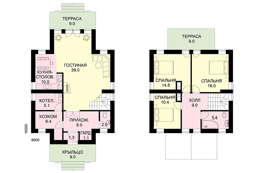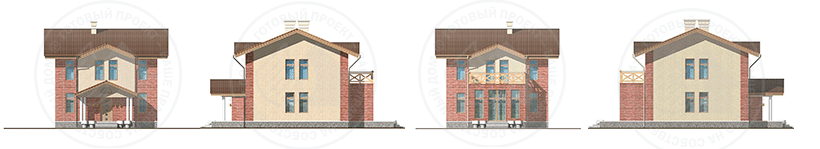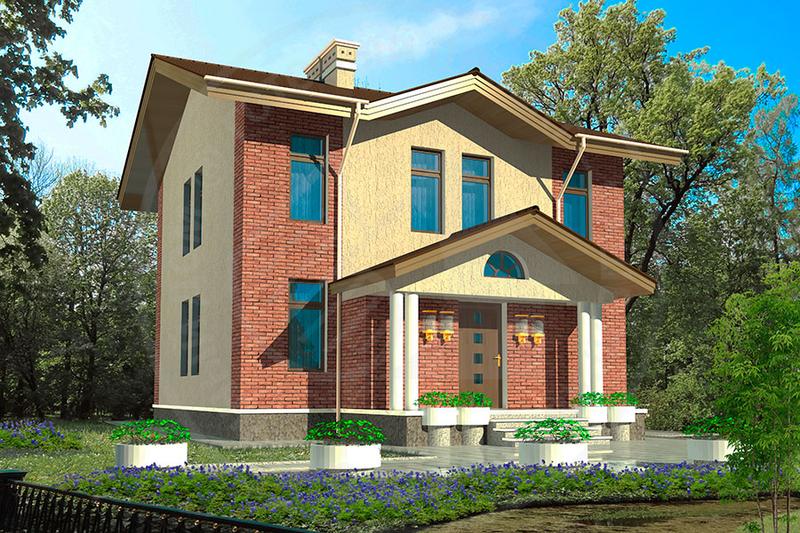 Уютный компактный коттедж со скатной кровлей, с ясно выраженным цельным симметричным объемом. Коттедж имеет выразительный главный фасад с четко обозначенным, выдвинутым вперед центральным ризалитом, с заглубленным главным входом в дом. Противоположный фасад, обращенный в сад, также имеет выступающую часть гостиной с террасой на втором этаже. Здание двухэтажное, без подвала и цокольного этажа. Планировка первого этажа решена с четким зонированием общего пространства, с лестницей в гостиной, ведущей на второй этаж. Светлая гостиная с камином совмещена с кухней, вместе они образуют единое пространство. В гостиной витраж с выходом на террасу сада. Из прихожей вход в техническое помещение с газовым котлом и бойлером для горячей воды, есть санузел и кладовая. На втором этаже три уютных спальни, две имеют выход на просторную террасу, обращенную в сад. На этаже одна удобная ванная комната.