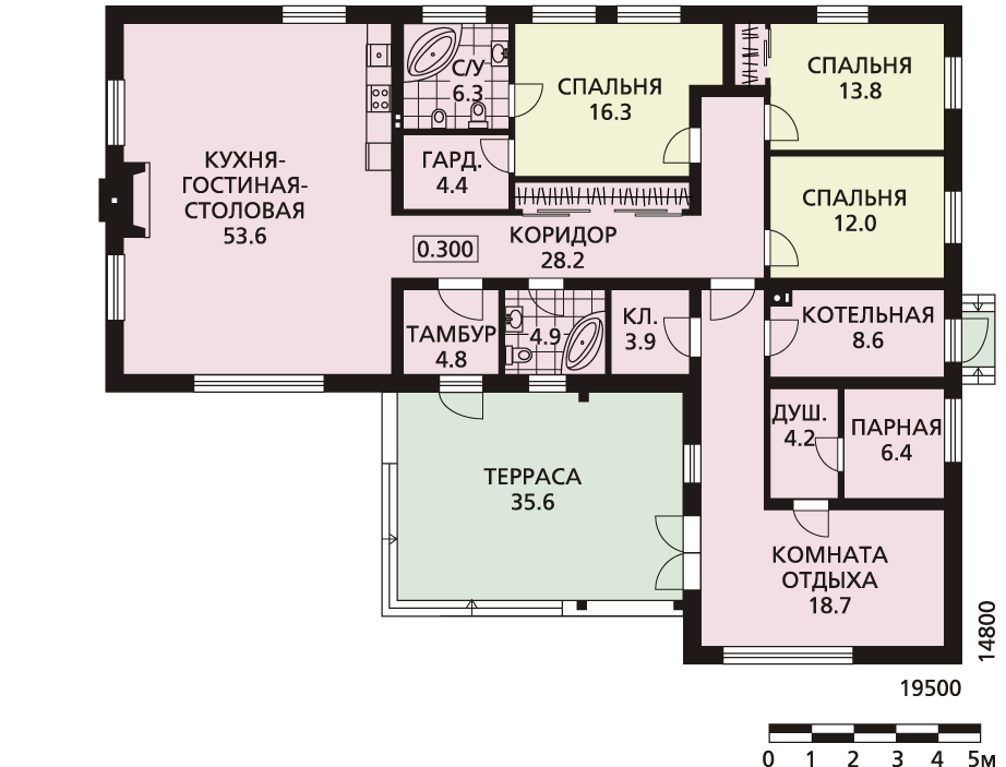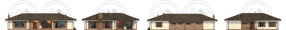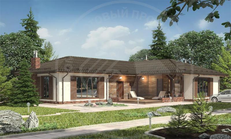 Удачное решение дома, планировка которого выполнена в одном уровне. Расположение помещений представлено таким образом, что жилые комнаты защищены с обеих сторон большими объемами. Просторная кухня-столовая с камином, обращенная к трем сторонам света, соберет домочадцев и гостей. В противоположном углу дома находится комната отдыха, в которой можно расслабиться после парной. Между этими объемами размещены три спальни, технические помещения и ванные комнаты.