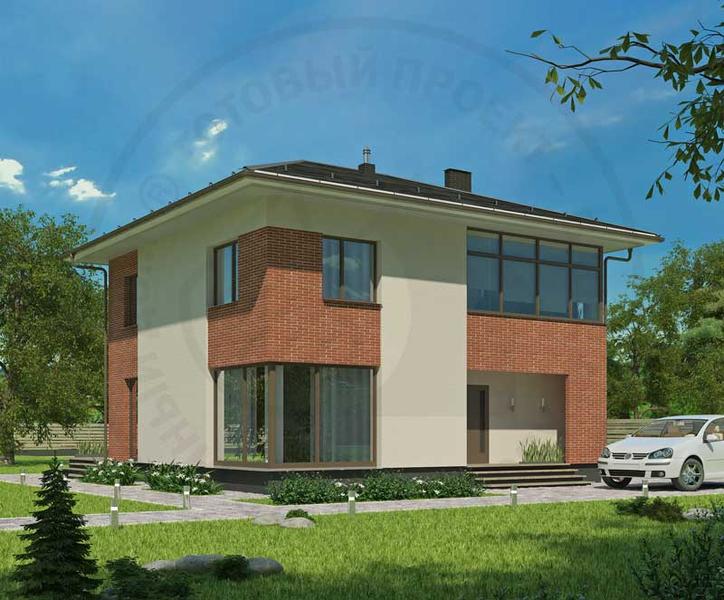 Лаконичный облик, оптимальная конструктивная схема и рациональность планировочного решения делают этот дом экономичным и пригодным для строительства на любом участке. Помещения первого этажа компактно размещены вокруг холла-прихожей и имеют двустороннюю ориентацию. Это позволяет более свободно ориентировать дом по сторонам света при посадке на участке. Просторная гостиная – одно из главных достоинств дома, она не только удобна для отдыха семьи, но и способна вместить большую компанию гостей. Из гостиной есть выход на обширную террасу, где в теплое время можно приготовить барбекю. В тихой зоне второго этажа расположены три спальни и большая ванная комната.