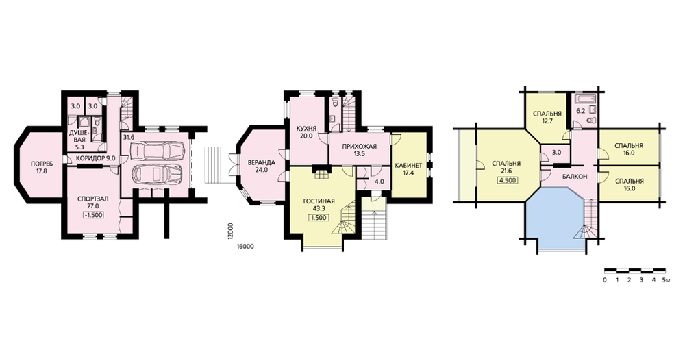 Крестообразная структура плана этого дома дает определенные преимущества в организации внутреннего пространства. Прежде всего, это позволяет устроить естественное освещение прихожей. Также это дает большие возможности оптимальной ориентации всех помещений дома по сторонам света. В цокольном этаже, который необязательно должен быть сильно заглублен, размещены гараж, блок помещений для отдыха и спорта, погреб. В первом этаже самое парадное помещение – двусветная гостиная с камином, открытой деревянной лестницей. Великолепный эркер позволяет хорошо осветить гостиную. Гостиная и кухня могут быть связаны не только через прихожую – перегородку между ними можно не делать. Это создает эффект анфиладности пространств.
