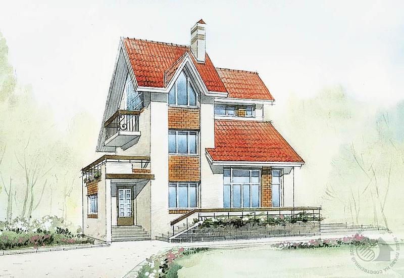 Комфортабельный дом для постоянного проживания имеет два этажа, мансарду и подвал. Богатая пластика фасадов, сложный силуэт хорошо впишутся в достаточно плотную застройку участка среди первозданной природы. Внешний облик дома в полной мере отвечает его внутреннему устройству. Большая гостиная-столовая с открытой лестницей, ведущей на галерею второго этажа, становится планировочным ядром дома. Удобные спальни второго этажа и мансарды образуют тихую интимную зону, хорошо связанную с природным окружением дома благодаря наличию балконов и панорамного остекления.