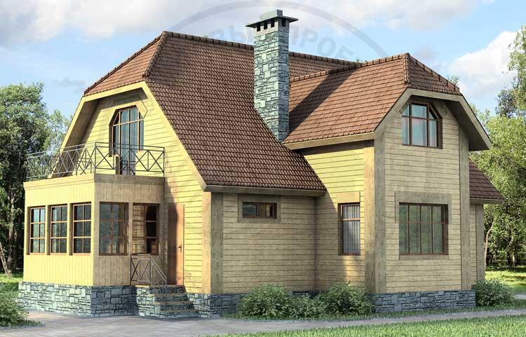 Простота внешнего облика этого дома и максимальный комфорт, обусловленный планировочным решением, понравятся многим. На первом этаже дома – большой холл со встроенными шкафами, гостиная и кухня-столовая, имеющие связь через арочный проем, а также вместительная ванная. В мансарде размещены три спальни, гардеробная, санузел. Большая терраса может стать отличным местом для отдыха летом. Дом экономичен и прост в исполнении. При желании внешний облик дома можно изменить за счет использования других материалов в отделке стен и цоколя.