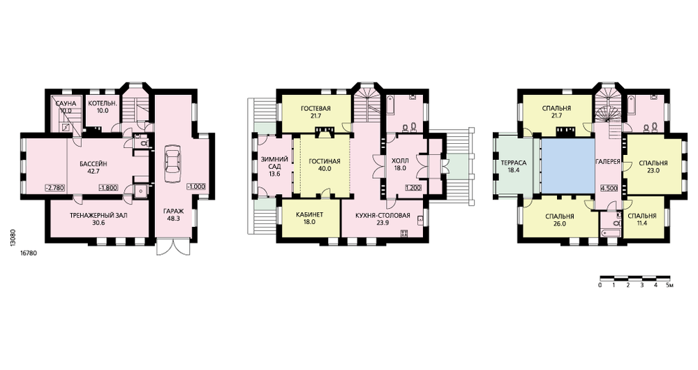 Строгий особняк выполнен в духе итальянских вилл эпохи Возрождения. Основой внутренней структуры этого представительного дома является двусветная гостиная с зимним садом, террасой и галереей второго этажа. Башенка, украшающая крышу дома, также вполне функциональна. На нее можно попасть по винтовой лестнице второго этажа. Это отличное место для библиотеки, кабинета или гостевой. В доме запроектирован цокольный этаж с гаражом, большим тренажерным залом, сауной, бассейном и необходимыми подсобными помещениями. Наличие естественного освещения и возможность попадания в подвал непосредственно из жилой части дает владельцам определенную свободу при размещении здесь каких-то иных служб.