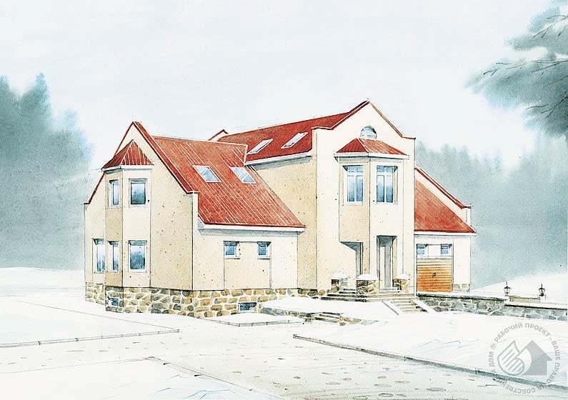 Перед вами респектабельный особняк, архитектурный облик которого формируется эркерами, расположенными по всем четырем фасадам. Планировочное решение соответствует высоким требованиям комфорта. Три уровня дома функционально разграничены по зонам: в подвале помимо подсобных служб предусмотрены площади для релаксации. Анфиладная по композиции центральная часть первого этажа включает прихожую, двусветный каминный зал и кухню-столовую. Прихожая сообщается с гаражом и комнатой отдыха при сауне. В составе помещений предусмотрена комната для горничной. Мансардный этаж – спальная зона дома.