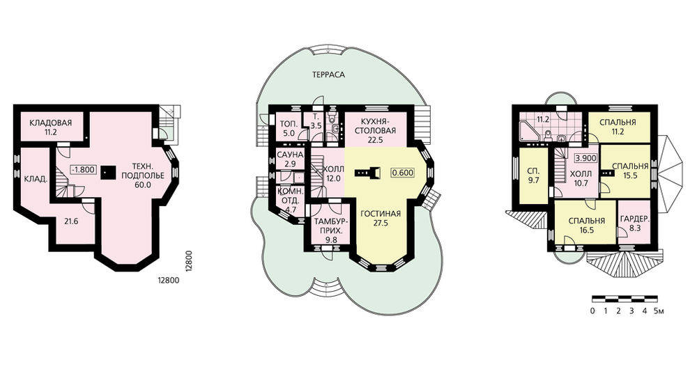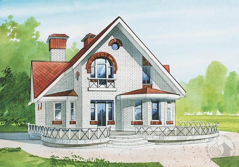 Этот коттедж привлекает к себе внимание незаурядным подходом к организации внутреннего и внешнего пространства. Дом имеет два жилых этажа и техподполье. Первый этаж решен по принципу свободно перетекающих пространств. Все помещения, составляющие гостевую зону – холл, гостиная и кухня-столовая, – объединены в одном объеме. Здесь же находится и открытая лестница, ведущая на мансардный этаж. Центром этого пространства является камин. Такая планировка предоставляет владельцам этого дома огромные возможности для реализации самых смелых творческих фантазий по организации жилой площади. Необычно решены и внешние элементы: красиво прорисованные дугообразные террасы создают неповторимый образ дома и являются гармоничным продолжением и дополнением его внутреннего пространства.