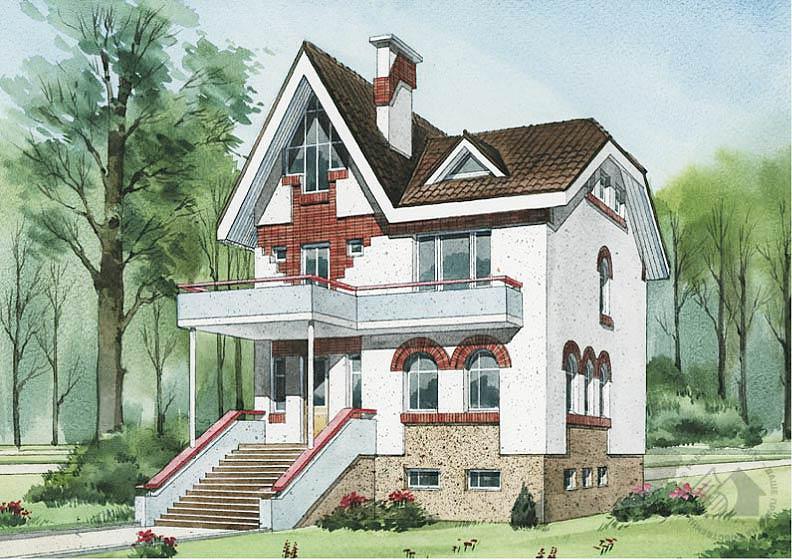 Этот дом, поднятый на высокий цоколь, может стать визуальной доминантой целого коттеджного поселка, его высота в коньке составляет без малого 14 метров. Но высота – не единственная особенность этого дома. Проект имеет большие резервы перепланировки внутреннего пространства. По широкой парадной лестнице мы поднимаемся на первый этаж, который представляет собой гостевую зону дома. Планировка и размер расположенных здесь помещений могут легко быть изменены за счет подвижки перегородок. Так, можно увеличить или уменьшить столовую и кабинет, а можно и совсем отказаться от этих помещений, увеличив таким образом гостиную. Ее зонирование может быть достигнуто оборудованием барной стойки или разными уровнями пола. Такие же возможности перепланировки имеет и второй – спальный этаж дома.