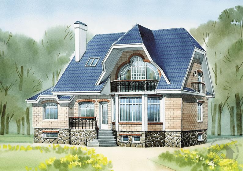 Внешняя привлекательность и великолепие больших, залитых светом внутренних пространств – отличительные черты этого загородного особняка. В доме достаточно помещений для общения и уединения членов большой семьи. Просторная, наполненная солнечным светом и воздухом гостиная – место сбора всей семьи. Ее площадь вполне позволяет совместить здесь ряд функций, например, перенести сюда кухонное оборудование и столовую. Это позволит получить дополнительное жилое помещение на первом этаже. В мансарде расположена приватная зона дома с тремя спальнями и вместительной ванной комнатой. Внешнюю привлекательность дому придают арочные окна мансардного этажа, кованые решетки ограждений, дугообразное оформление оконных проемов.