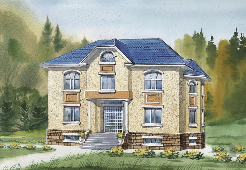 Классический особняк со строго симметричным главным фасадом. Основной вход в дом акцентирован широкой лестницей и парадным порталом с колоннами. В доме два жилых этажа, заглубленный на половину высоты цокольный этаж и чердак. По проекту чердак не эксплуатируется, но при необходимости его можно оборудовать под жилые помещения, тем более что высота в коньке составляет почти четыре метра. Цокольный этаж – резерв жилой площади дома, по проекту здесь предлагается разместить котельную, мастерскую и тренажерный зал, назначение этих помещений может быть изменено по желанию заказчиков. Первый этаж – гостевая зона дома, дополненная небольшой спальней. Еще четыре спальни расположены на втором этаже. Они группируются вокруг просторного, светлого холла, часть которого при необходимости также может быть переоборудована в спальню.