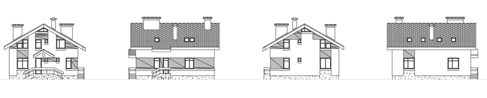 Этот проект может служить примером создания гармоничного облика загородного дома с привлечением минимума архитектурных средств. Простой объем, простой силуэт двускатной кровли, максимальная рациональность внутренней планировки – все говорит о том, что этот дом ориентирован на заказчиков, стремящихся к комфорту при минимальных затратах. При этом внешне дом достаточно симпатичен, что достигается за счет выверенных пропорций и грамотного цветового решения фасадов. А рациональность внутренней планировки отнюдь не в ущерб удобству и комфорту проживания. Так, каждая из четырех спален мансарды имеет свою ванную комнату и гардеробную, что довольно редко встречается даже в более роскошных особняках. Еще одна спальня находится на первом этаже, она также оборудована своей ванной и гардеробной. Единое пространство гостиной и кухни-столовой может быть расширено за счет площади лестничного холла.