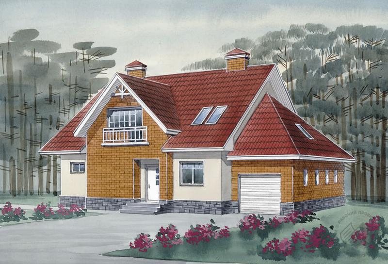 Добротный, экономичный дом – хороший выбор для небольшой семьи. Простые и строгие фасады, рациональная планировка, строительные материалы, предложенные в проекте – все способствует оптимизации затрат на строительство и эксплуатацию. Дом представляет собой блокировку двух объемов: жилой части и гаража. Планировочное решение традиционно. На первом этаже находятся помещения дневного пребывания семьи, в мансарде – спальни. Центральное место на первом этаже занимает гостиная, от кухни-столовой она отделена капитальной стеной и не связана с ней напрямую. Зато из гостиной есть выход на открытую террасу со стороны сада. Мансардный этаж практически полностью находится под крышей. Такое решение неизбежно привело к необходимости верхнего освещения. Мансардные окна очень активно используются в данном проекте для освещения спален и ванной.