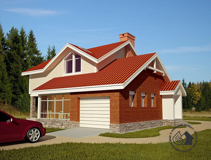Этот компактный дом с мансардой отличается высокой степенью функциональности: небольшая площадь, отсутствие подвала, минимум транзитных зон и при этом максимум комфорта для небольшой семьи. Выразительный, пластичный объем дома сочетается с лаконичными, современно решенными фасадами. Главный вход устроен с угла дома и через тамбур ведет в небольшую, но хорошо освещенную прихожую. Отсюда можно попасть в гостиную и смежную с ней кухню или подняться по лестнице на мансардный этаж. Гостиная освещается через большой угловой витраж, который очень эффектно смотрится на фасадах дома. Гараж и котельная изолированы и не имеют внутренней связи с другими помещениями дома, попасть в них можно с улицы. Эти помещения и часть гостиной находятся в одноэтажной пристройке. В мансарде в небольшой светлый холл-коридор выходят три спальни и ванная комната.