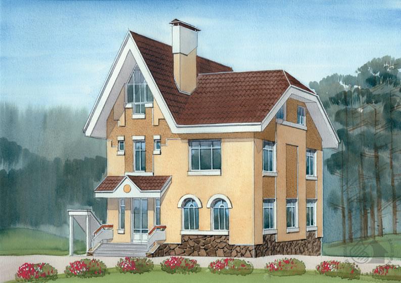 Современный, комфортабельный и очень рационально спланированный коттедж. При небольшом пятне застройки в доме удалось разместить все помещения, обеспечивающие максимальный комфорт проживания. Это и зона релаксации в цокольном этаже с сауной, тренажерным залом и моечной, в которой вполне возможна установка небольшого бассейна. Это и помещения дневного пребывания на первом этаже с просторной гостиной, столовой и кухней. Перегородка, разделяющая гостиную и столовую, может быть раздвижной, остекленной или отсутствовать совсем. На втором этаже дома расположены три спальни и ванная комната. Планировка двух смежных спален может быть изменена за счет подвижки разделяющей их перегородки. Здесь можно устроить гардеробные или кладовые. Светлые и достаточно высокие помещения мансарды могут использоваться как спальные комнаты.