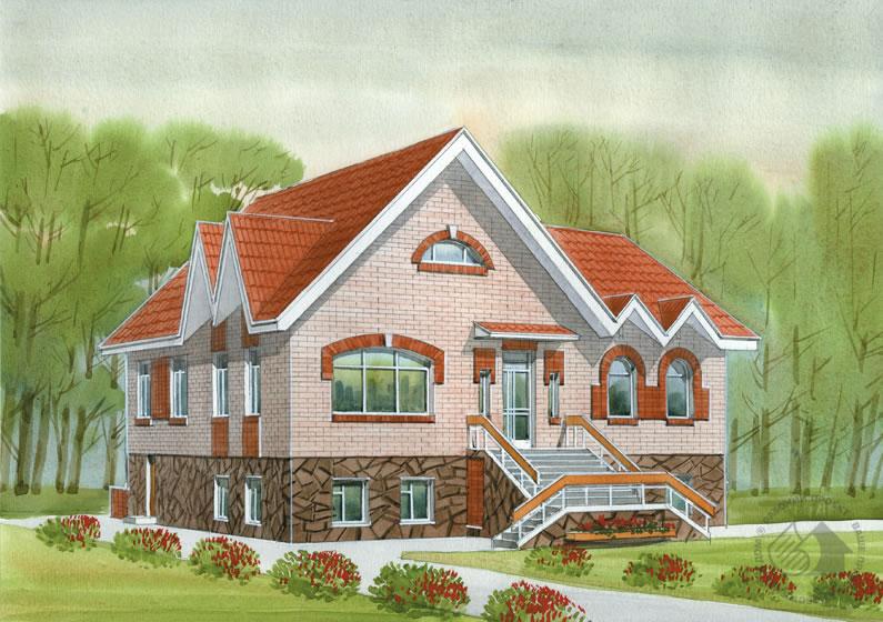 Просторный, почти квадратный в плане особняк потребует и большого пятна застройки. Далеко вынесенная лестница главного фасада и терраса на противоположной стороне дома еще больше усугубляют эту ситуацию. Зато все жилые помещения удалось расположить на первом этаже и избавить обитателей дома от беготни по лестнице. К достоинствам дома можно отнести и минимальное заглубление цокольного этажа, что позволяет заезжать в расположенный здесь гараж с отметки земли. Первый, жилой этаж дома функционально поделен на две части: гостевую и спальную. Каждая из этих зон имеет свой вход, свой санитарный узел и достаточно автономна. При этом они удобно связаны между собой. Просторная гостиная, кухня, три спальни – состав помещений, вполне достаточный для комфортного проживания семьи. Дополняют планировку помещения цокольного этажа: гараж, мастерская и зона релаксации.