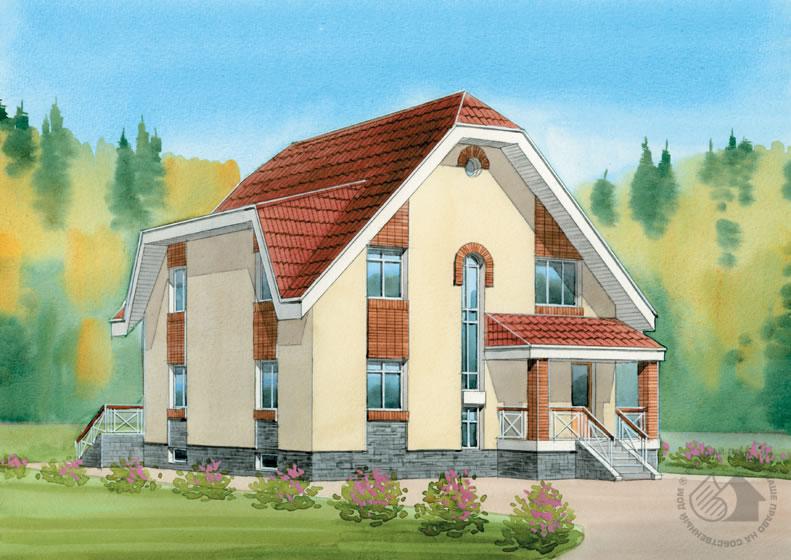 Современный, комфортабельный, достаточно вместительный и в то же время компактный особняк. Такой дом с логичным, рациональным решением – образец жилья современного делового человека. Фасады лаконичны, планировка проста и удобна. В доме два жилых этажа и эксплуатируемая цокольная часть. В цоколе расположены котельная со своим отдельным выходом на улицу, сауна, комната отдыха и кладовая. Первый этаж – зона дневного пребывания семьи, в которой жилые помещения очень удачно дополнены просторной, крытой террасой. Удобно решена входная зона со светлой прихожей и кладовой. Небольшая жилая комната дополняет гостевую зону первого этажа. Второй этаж – традиционно спальная зона с рациональной и одновременно комфортабельной планировкой, в которую включены четыре спальни, гардеробная и ванная комната. Балкон на всю ширину дома прикрыт скатами кровли.