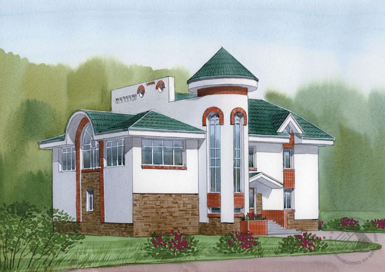 Просторный кирпичный двухэтажный особняк с мансардой и техническим подпольем. По своему объемно-планировочному решению он достаточно прост, изюминкой, формирующей весь облик и придающей неповторимость, является полукруглая башня-эркер с шатровой кровлей. Она расположена на главном фасаде, внутри нее спрятана лестница. Первый этаж имеет четкое трехпролетное членение. В одном из пролетов расположена зона релаксации с бассейном и сауной, в другом – входной блок с холлом и лестницей, третий пролет целиком занят гостиной. Это огромное 64-метровое помещение предоставляет неограниченный простор творческой фантазии дизайнера. Второй этаж повторяет планировочную структуру первого, по обе стороны от центрального холла расположены жилые помещения. С одной стороны это спальни и кабинет, с другой – просторный, светлый зал, который может служить второй гостиной или зимним садом.