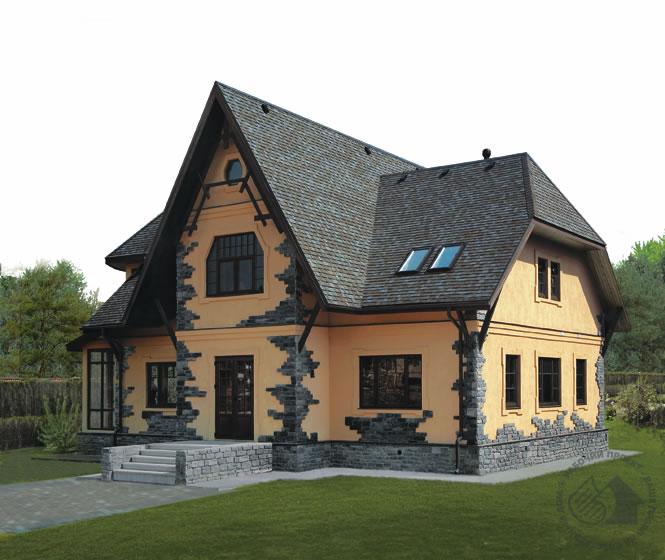 Комфортабельный, вместительный и просто красивый каркасный дом. В отличие от привычных для нас небольших, лаконичных каркасных домов, данный проект отличается респектабельностью и изысканностью. Объемно-планировочные характеристики и внешний декор позволяют отнести этот дом к разряду фешенебельных особняков. Великолепный полукруглый эркер, декоративный фахверк, высокие фронтоны кровли исключают его из ряда утилитарных каркасных построек. Дом двухэтажный, с небольшим подвалом. Центральный пролет первого этажа – рекреационная зона дома с тамбуром, прихожей и лестничным холлом. Справа расположена кухня-столовая, слева – просторная гостиная с камином. Благодаря великолепному остекленному на всю высоту эркеру и угловому витражу естественное освещение здесь будет на протяжении всего дня. На мансардном этаже расположены четыре спальни и ванная комната. В спальне хозяев дома предусмотрена кладовая.