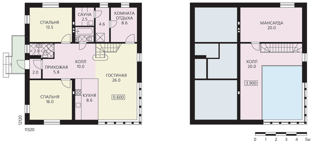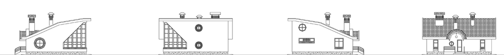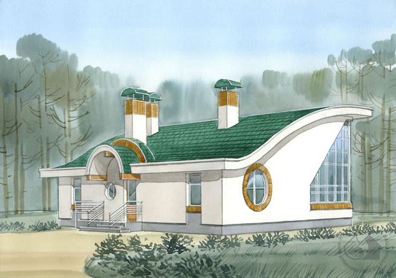 Дом с изогнутой кровлей и угловым витражом сразу выделяется из общего ряда загородных построек. Внутренняя планировка также необычна, но при этом комфортабельна. В первую очередь это относится к гостиной с великолепным угловым двусветным витражом. Благодаря этому витражу создается необычное интерьерное пространство с удивительным угловым освещением. Остальные помещения первого этажа решены достаточно традиционно: это две небольшие спальни, расположенные при входе в дом, и небольшой блок релаксации с сауной и комнатой отдыха. В мансарде используется лишь часть площади. Здесь находятся холл-галерея второго света гостиной и мансардное помещение, которое может использоваться как спальня. В доме нет подвала, чердак отсутствует.