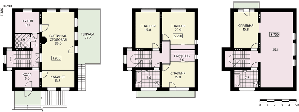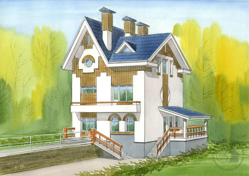Как это ни парадоксально звучит для индивидуального загородного дома, но перед вами высотный дом. Его высота в коньке более 15 м, и в нем насчитывается четыре этажа. Такая высотность дома позволяет при большой площади иметь компактное пятно застройки, а значит, посадить дом на маленький участок. Это очень удобно для заказчиков, располагающих маленьким участком, но мечтающим о большом, комфортабельном особняке. В цокольном, не показанном на планах, этаже дома расположены бассейн, сауна и тренажерный зал, через топочную отсюда можно выйти на улицу. Первый и второй этажи – жилая часть дома, первый этаж – гостевая, второй – спальная. В мансарде находятся еще два светлых помещения. Наличие ванной комнаты позволяет оборудовать здесь дополнительные спальни. Их количество и габариты определят владельцы дома. К достоинствам проекта можно отнести возможность посадки дома на рельеф.