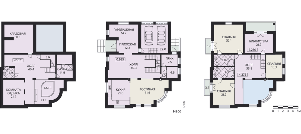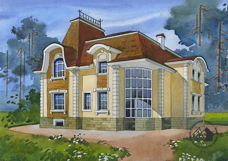 Трехэтажный особняк в романтическом духе. Эклектичность стилистики его внешнего облика изящна и утонченна, притом, что ее сложно отнести какому-то из архитектурных стилей, дом смотрится очень красиво. При таком стремлении к внешней эффектности не осталась без внимания и комфортность планировки. В цокольном этаже предусмотрены бассейн, сауна, комната отдыха и бильярдная. Первый этаж – с размахом решенная гостевая зона. Большая светлая прихожая, сорокаметровый холл, гостиная с великолепным полукруглым витражом образуют единое, сложное и очень интересное пространство. Удобно решен запасной вход в дом, со своим крылечком и прихожей. Спальная зона второго этажа не менее комфортабельна. Расположенные здесь помещения выходят в холл и на балкон второго света гостиной. Это большое светлое, наполненное воздухом пространство. В холле вполне возможно разместить декоративные растения, создав импровизированный зимний сад.